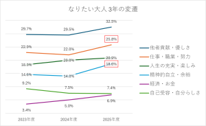 3年間の推移で最も顕著だったのは、「他者貢献・優しさ」を挙げる生徒が、29.7%(2023年)から32.5%(2025年)へと年々増加している点です。