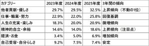 2025年度の最新データで特に注目すべきは、「精神的自立・余裕」への言及が前年比で大きく伸びていることです(14.0% → 18.6%)。